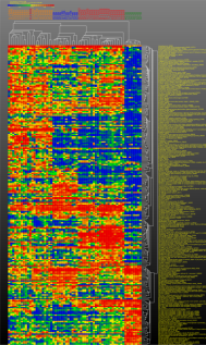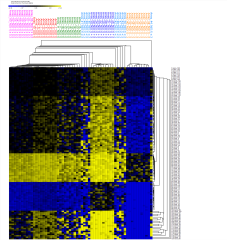 Khan et al, log_2 scale, t-test (EWS vs. BL classes), 125 genes < Bonf=0.01, delta of average expression