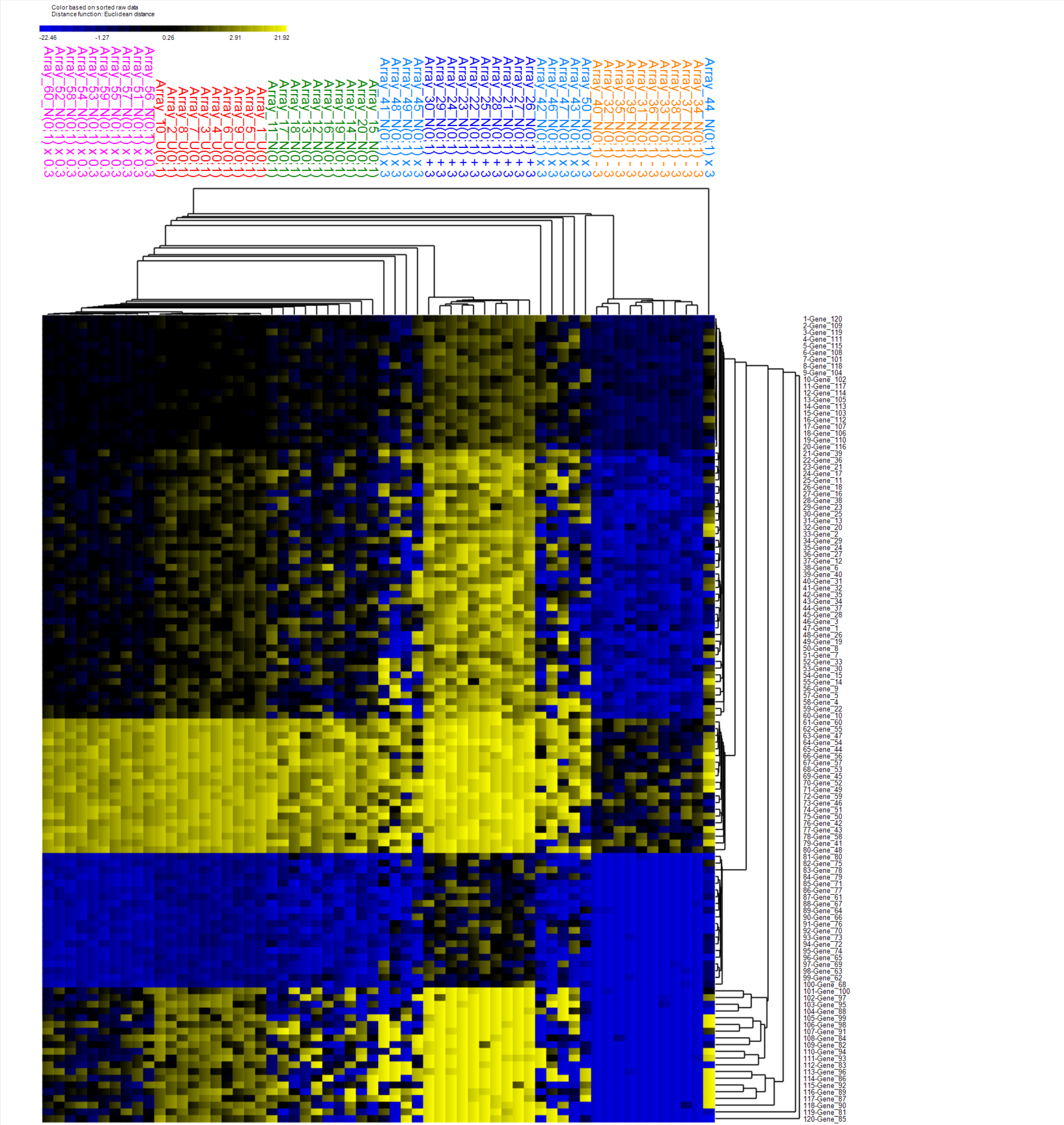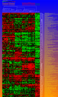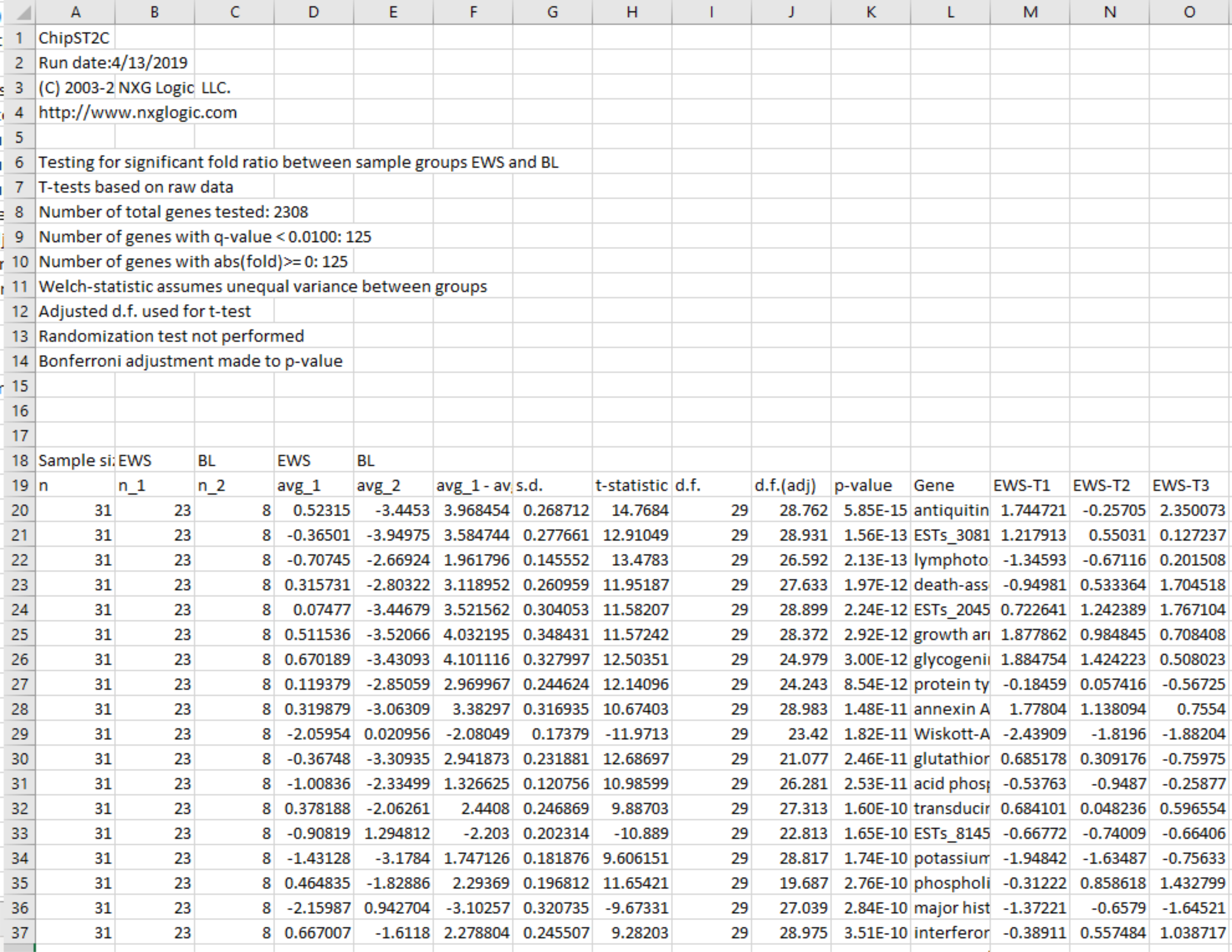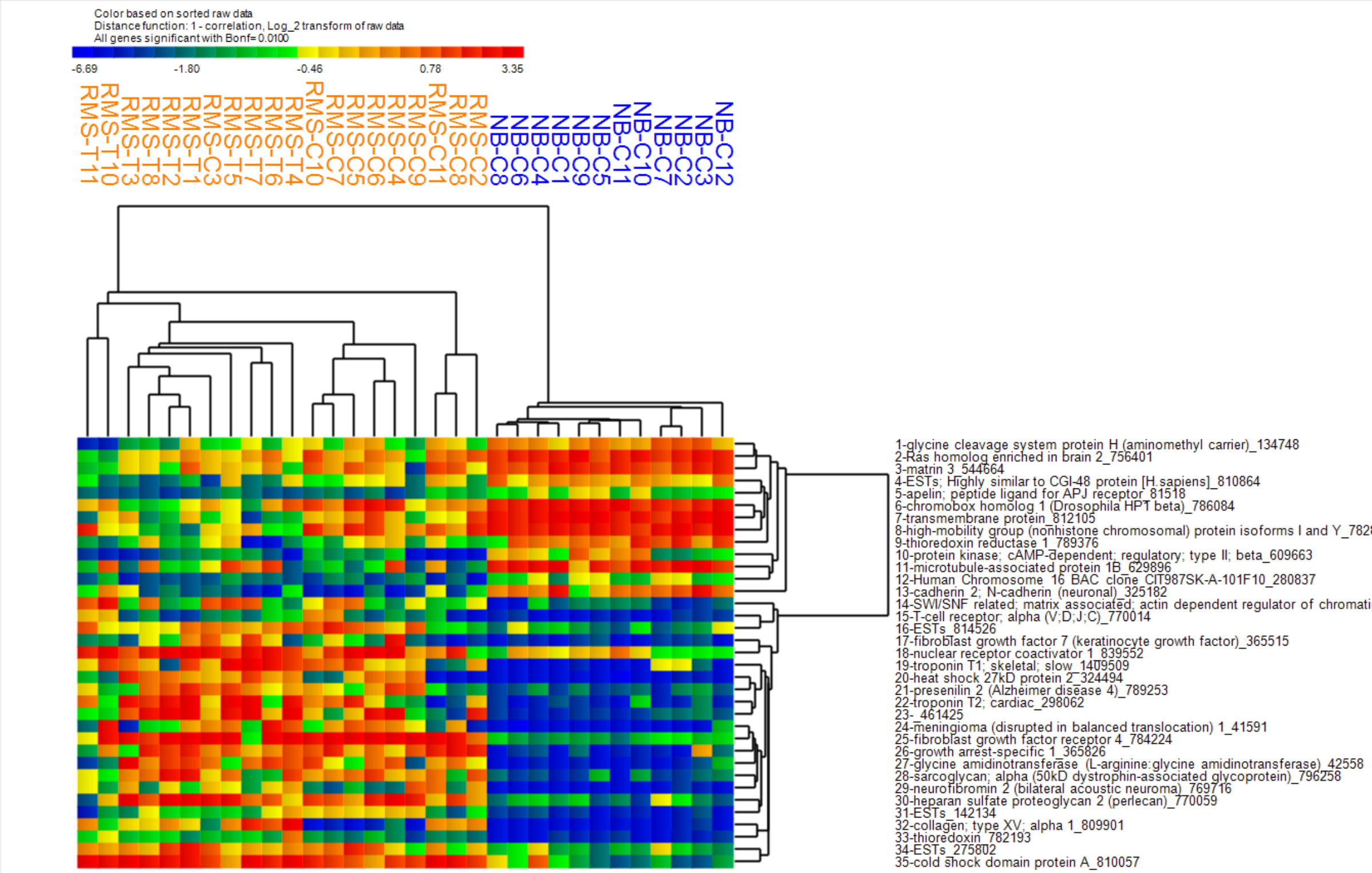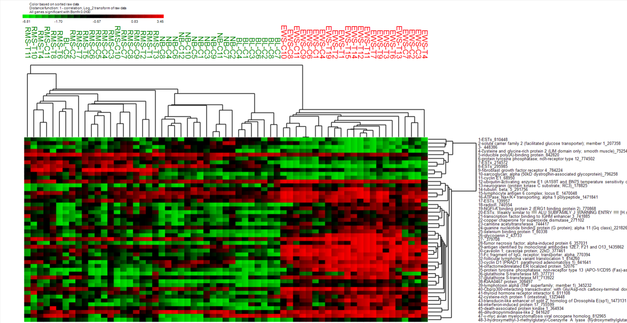 Khan et al, log_2 scale, t-test (EWS vs. BL classes), 125 genes < Bonf=0.01, fold ratio using geometric means (GM)